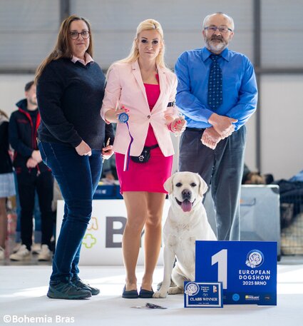 We are very happy and our thanks to both judges. To Mr. Peter Rehanek for the award the 1. place and title BOB in the breed LABRADOR RETRIEVER and to Mrs. Zdenka Jílková for the 1. place in VIII. group FCI and award of the title BIG.